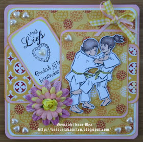 Hallo allemaal. Vandaag heb ik een kaart klaar die bestemt is voor mijn kleindochter. Zij zit nog niet zo lang op judo en mag aan een wedstrijd meedoen voor de gele slip. Omdat zij van de kleuren roze en geel houd heb ik de kaart dus met die kleuren gemaakt. De kaart is gemaakt naar een sketch die gevraagd werd bij de challenge van Kartenallerlei. Verder heb ik als dessinpapier vouwblaadjes van de Action gebruikt. Alle randjes van de verschillende onderdelen heb ik met een geel blokje(Kruidvat) geinkt. Het stempeltje van de judoende kinderen heb ik op internet gevonden en verkleind(kleurplaat). Ik heb het ingekleurd met de copics. De tekststempeltjes zijn van Art Talent(Boekenvoordeel). De kaart is afgewerkt met een grote bloem, een dubbelstrikje gemaakt met mijn strikjesmaker en straszsteentjes in de vorm van een hartje(ooit gewonnen bij Nadia). Zo ziet de kaart er dus uit en ik ben erg benieuwd wat mijn kleindochter ervan vind als ze het ontvangt......